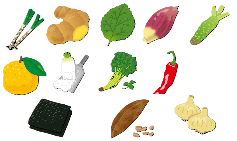 ワサビ、ニンニク、唐辛子、みつ葉、柚子、大根おろし、
